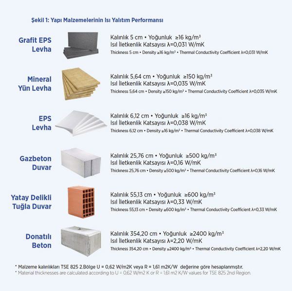Yani ısı yalıtım malzemelerinde bu değer küçüldükçe malzemenin ısı yalıtım performansı da o kadar artar (Şekil 1). Isıl iletkenlik değeri, malzeme kalınlığıyla birlikte, yapıların ısı yalıtım projelerinin hazırlanmasında kullanılır.